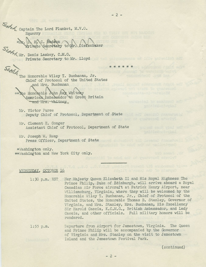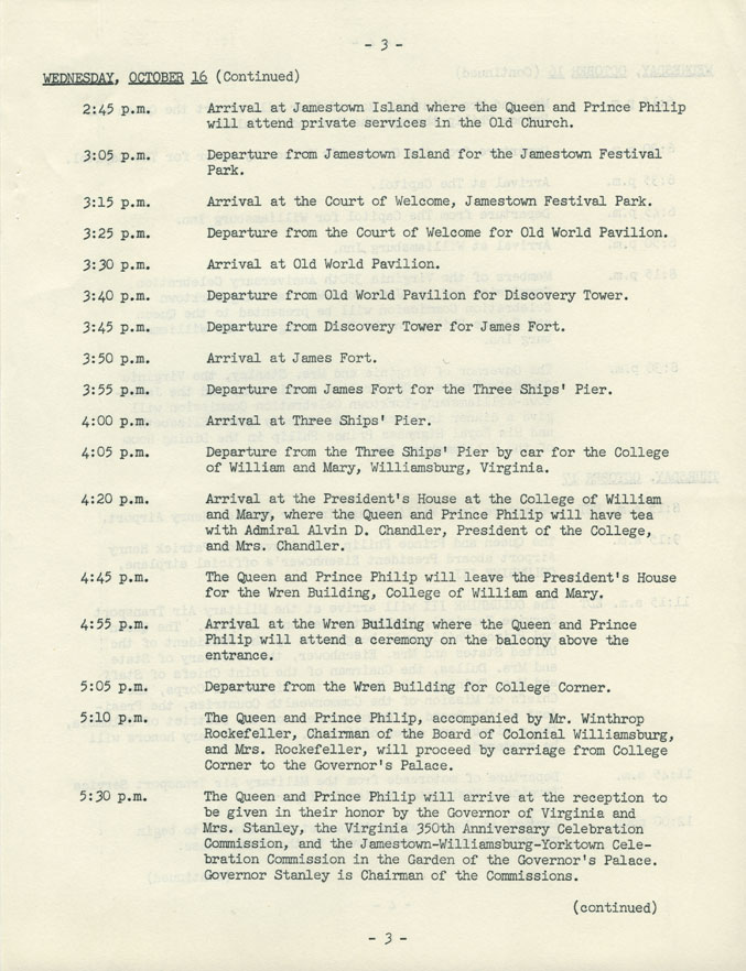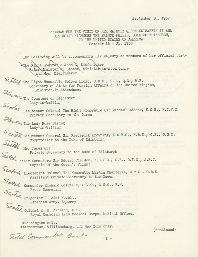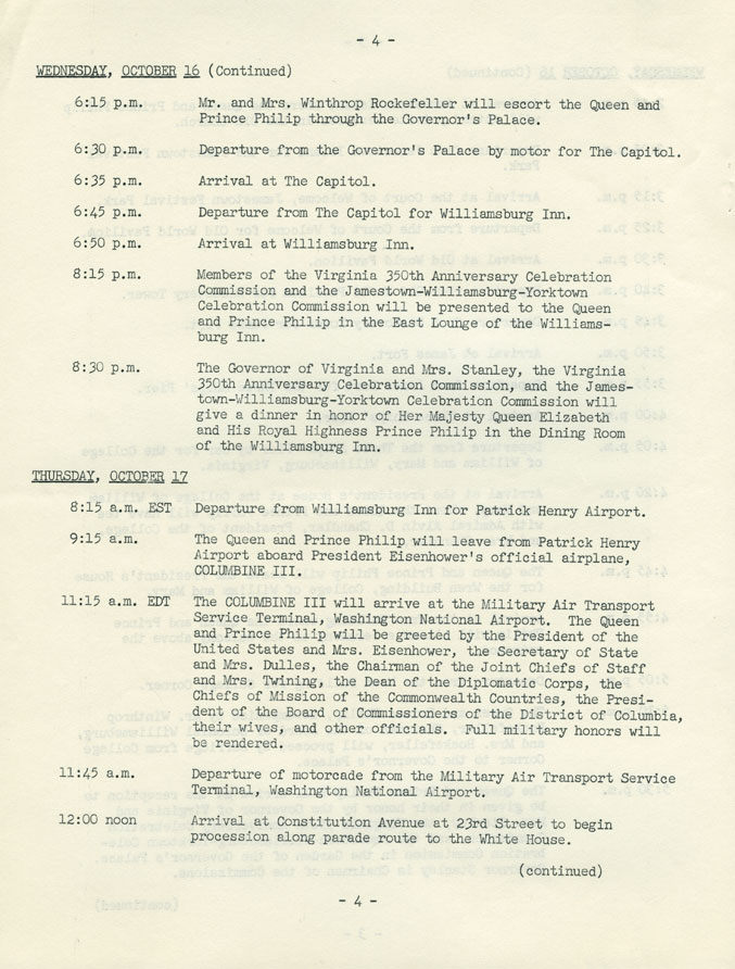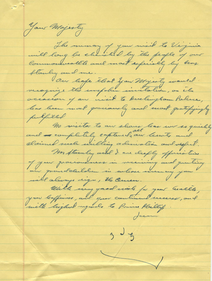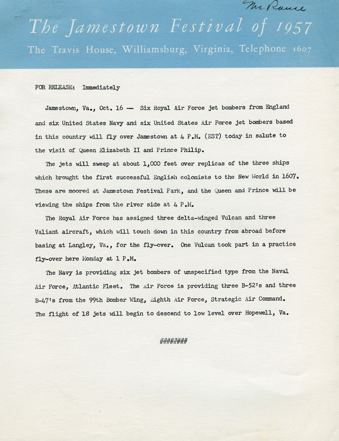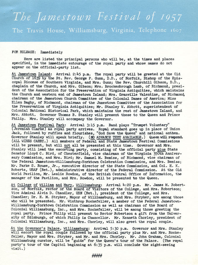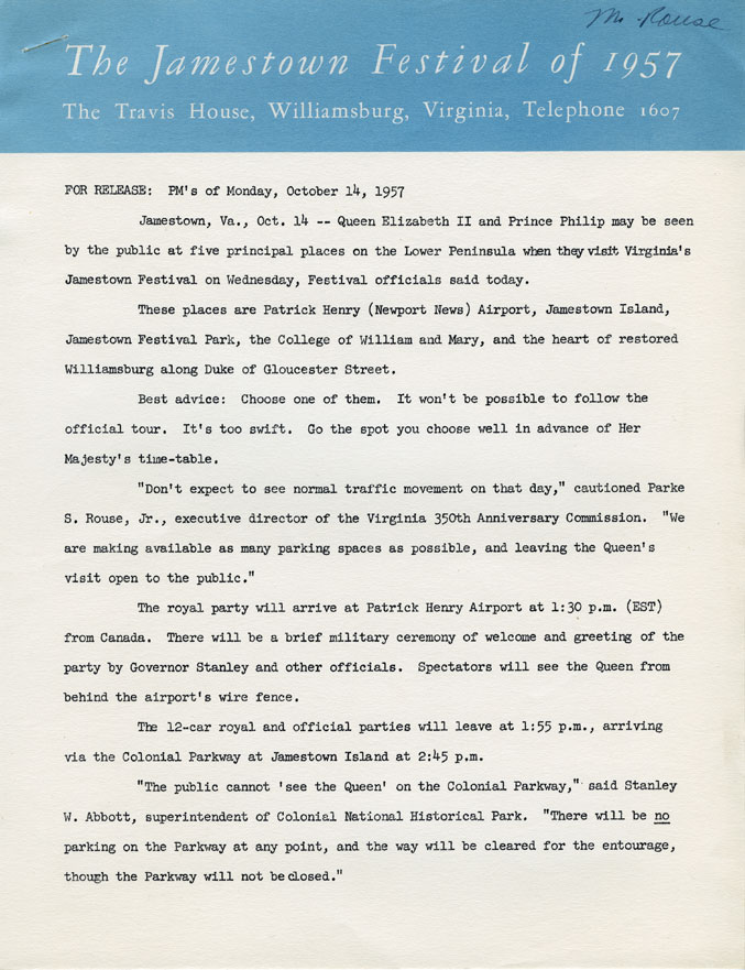 Various state agencies were charged with planning and coordinating the visit of Queen Elizabeth II in 1957. Principal among these were the 350th Anniversary Commission, created by an act of the General Assembly on April 3, 1954, to develop and coordinate the Jamestown commemoration, and the governor’s office. Documents from these agencies reveal the remarkable complexity of organizing the queen’s visit and the attention to detail required to plan every aspect of hosting a queen, from promulgating elaborate rules for the press corps to ensuring the use of the correct forms of salutation. Click on the images below to see a sampling of these documents from the Library of Virginia's collections.