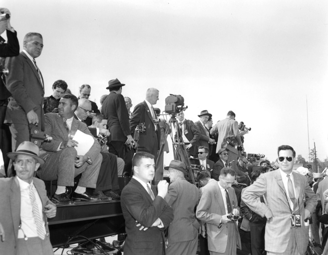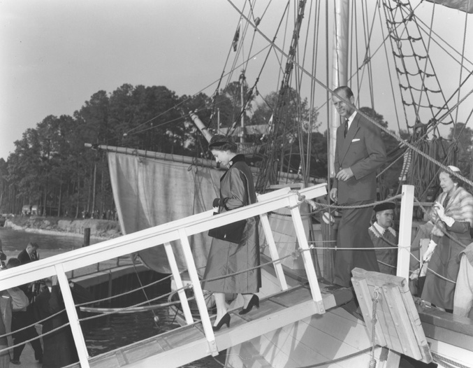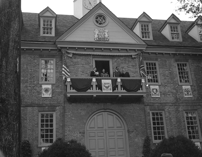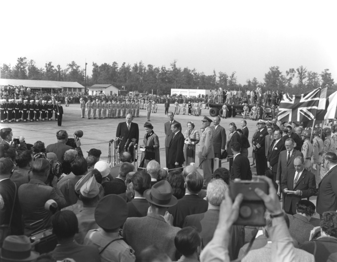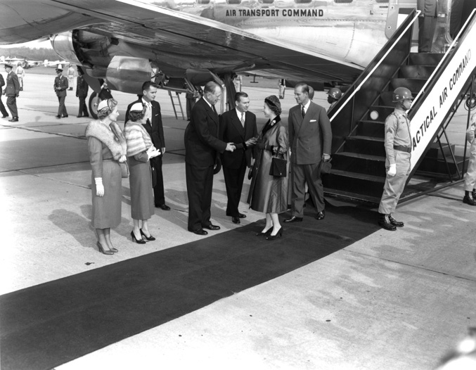 Queen Elizabeth II addresses the press and assembled military units at Patrick Henry Airport (now Newport News/Williamsburg International Airport). This image is from the Library’s Virginia State Chamber of Commerce photographs, a collection of 31,599 photograph negatives created during the first fifty years of the chamber’s existence.